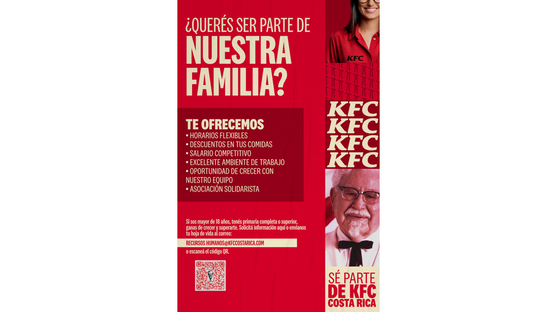 Requerimos colaboradores para formar parte del equipo de trabajo de KFC Costa Rica, S.A. en la zona de SAN JOSÉ, PAVAS. Buscamos personas con habilidades en comunicación asertiva, excelentes relaciones interpersonales, orientación al cliente, trabajo en equipo, atención al detalle, control de calidad y preocupación por el orden, la calidad y la presión.